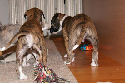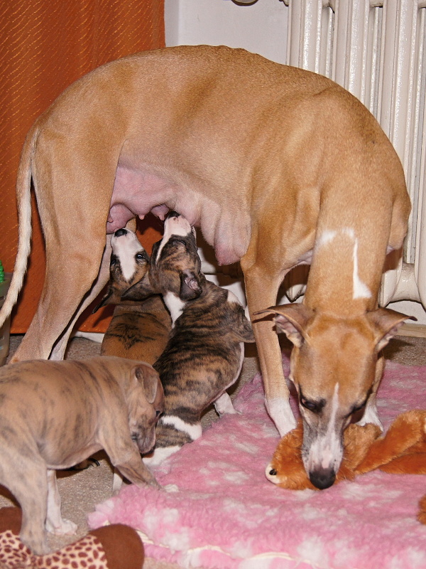W środę szczeniaki skończyły cztery tygodnie – jak ten czas leci….. W tym tygodniu zaczęły poznawać życie poza kojcem i wreszcie mogą ćwiczyć bieganie i kicanie na większej przestrzeni :). Poza bieganiem ćwiczą również “chwile skupienia”;). Niestety na podkład niezawsze uda się trafić, a więc trzeba mieć oczy dookoła głowy, bo można się poślizgnąć na “skórce od banana”. Co przy dziewiątce nie zawsze jest łatwe, ale jakoś dajemy radę :)).