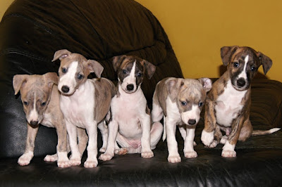 Tak jak wspomniałam w poprzednim wpisie szczeniaki przeniosły sie do domu Gosi Białogłowy. Warszawę opuściły chyba bez żalu (żaden nawet nie pisnął podczas drogi – “moje podróżniczki”), a w nowym miejscu odnalazły się bardzo szybko. Mają do własnej dyspozycji duży pokój, a w nim oprócz dwóch psich posłań i zabawek również skórzaną kanapę ( he he żeby im się tylko w głowach nie poprzewracało od tych luksusów 😉 ) . Gdy czasem usiądę na kanapie to natychmiast jestem oblegana przez całą dziewiątkę maluchów. Wszystkie szczeniaki są jak bumerangi :)! Po zestawieniu na podłogę, w kilka sekund są znów przy mnie – wskakują na oparcie psiego posłania, a z oparcia na kanapę. To dla nich wspaniała zabawa ;).